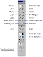 En la parte izquierda de la ventana podemos observar (ver figura anterior) la paleta de herramientas que vamos a utilizar para lograr nuestra animación. Aquellos que ya han utilizado algún programa gráfico reconocerán todas las herramientas, a aquellos que no, les pido que sin miedo comiencen a “jugar”, a interiorizarse más con estas herramientas, total, ante la duda, comienzan otro nuevo stage y listo.