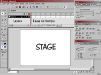 Cuando abrimos el programa, lo primero que encontramos es la pantalla en blanco, lo que llamamos comúnmente “STAGE”, el escenario, la pantalla donde vamos a realizar toda la animación. Por arriba podemos observar, la linea de tiempo que está compuesta por FRAMES (cuadros) y LAYERS (capas).