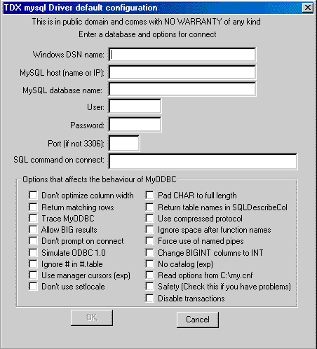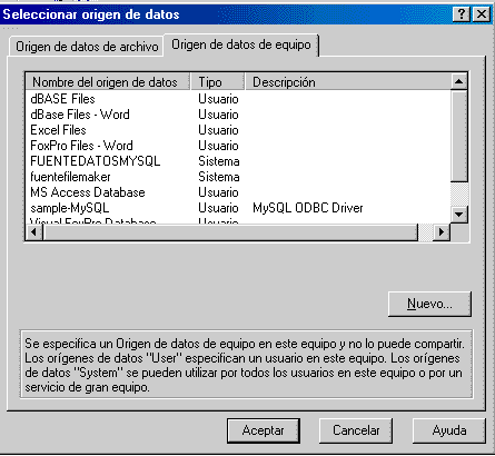 Seleccionar origen de datos de equipo, y dentro de esta, el nombre de la fuente de datos que hemos creado anteriormente. Una vez la has seleccionado, y has hecho clic sobre "Aceptar", aparecerá la pantalla de configuración del driver por si deseas marcar para esta acción en concreto, algunas de las opciones de configuración que aparecen en el driver ODBC, si no deseas marcar ninguna, clic sobre "OK".