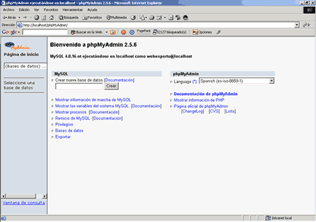 Configurando las líneas señaladas anteriormente ya estamos habilitados para utilizar la herramienta. En el navegador ingresamos a la dirección correspondiente http://localhost/phpMyAdmin