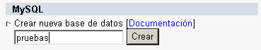 En la página principal completamos el campo del formulario con el nombre de la base de datos deseada (pruebas) y apretamos sobre el botón Crear.