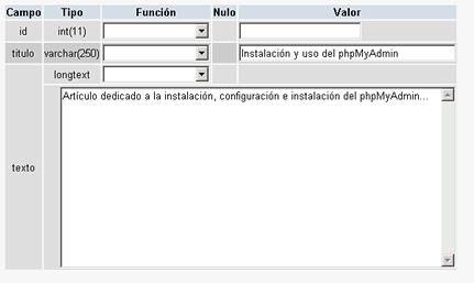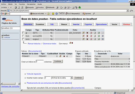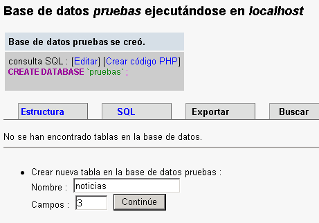 En la página siguiente, creamos una tabla (noticias) y la cantidad de campos (3).