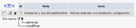 Los datos de la tabla pueden ser visualizados clickeando sobre Examinar, con el cual veremos un listado de los diferentes registros contenidos en la tabla. Allí mismo, se permite la opción de Editar y Eliminar los mismos.